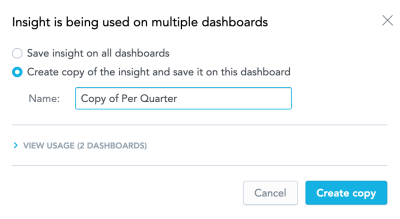 5. If the insight is included on multiple dashboards and you want to update it only for the current dashboard, select Create copy of the insight and save it on this dashboard , type a new name and click Create a copy .