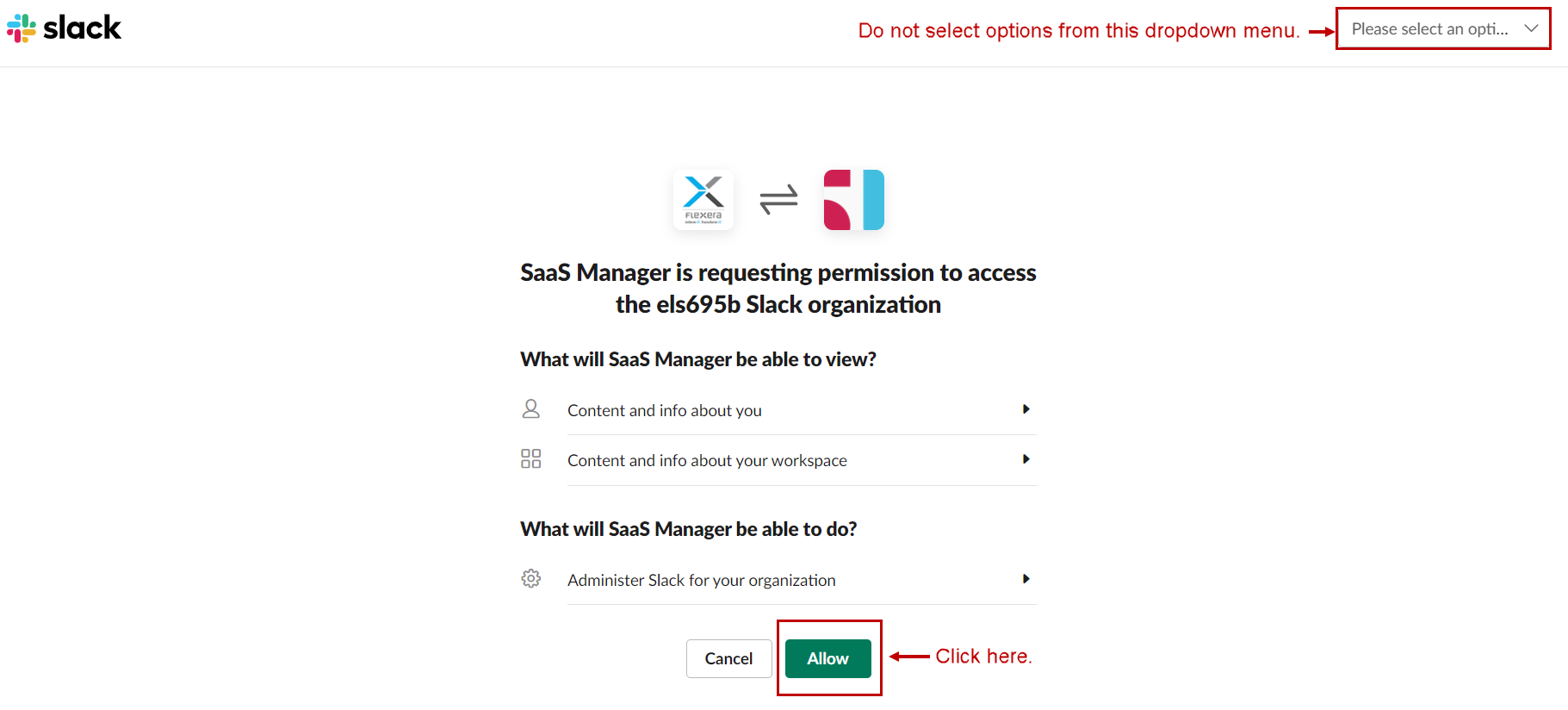 Do not select any specific workspace from the Please select an Option dropdown menu in the top-right corner as SaaS Management needs to be installed on the entire Slack organization.